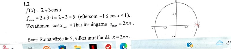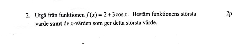 Ja precis men jag syftar på största värdet som bara cos(x) kan anta och det är ju bara 1. Själva frågan är ju största värdet för funktionen y=2+3cos(x) som den kan anta och den fick jag ju till 5.