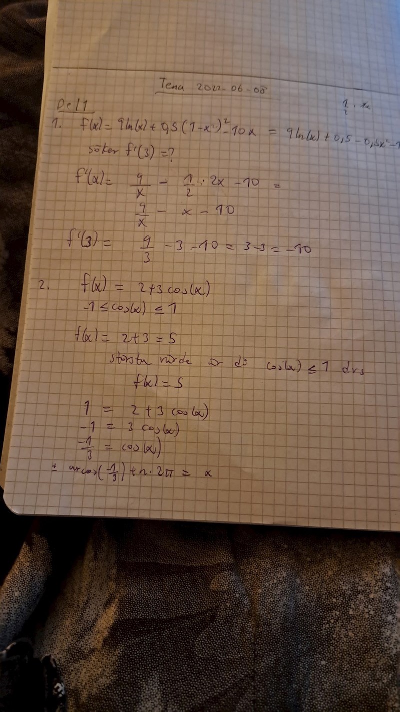 Jag förstår ej varför mina lösningar på x1 och x2 inte godtas enligt facit. Jag löste andra delen av uppgiften som en trigonometrisk ekvation. Som jag förstår så söker vi de x-värden där cos(x) antar sitt största värde dvs y=1.