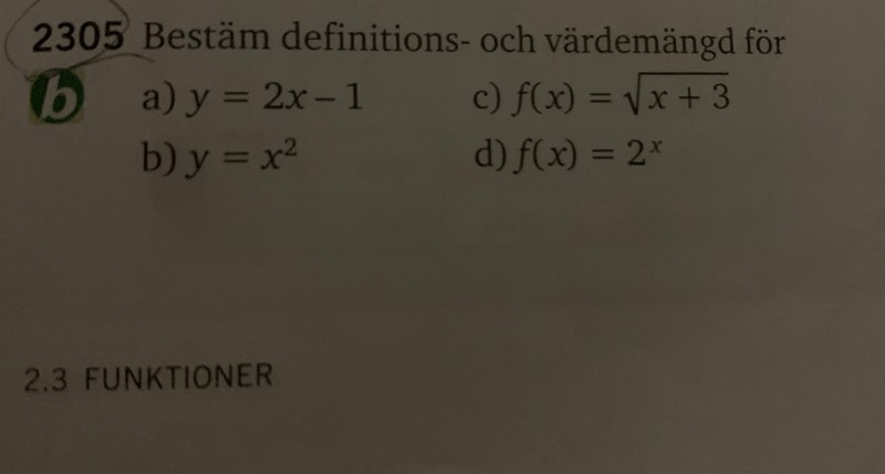 b) Sätter du t ex in x=-4 så blir y=, vilket inte är reellt och inte y är definierat för. Sätter du x=-3 blir y=,vilket är giltigt.Sätter du in x=6 blir y=osv. Alltså är definitionsmängden x och y (värdemängden).