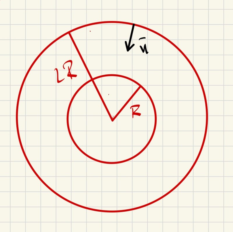 Normalen är vinkelrät mot den yttre randytan. Borde vi inte ha en till normal som är vinkelrät mot den inre randytan med R?