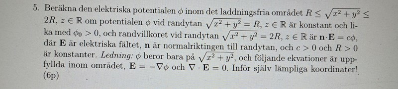 Nej asså jag hänger inte med på vilka villkor du menar. Vi har ju n=-e_r och E=dphi/dr. Sen har jag ju phi(r)=aln(r)+C2 och stoppar man in R så ska det bli lika med phi0. Såhär långt förstår jag. Men sen det här med normalen och E och den där randvillkor förstår jag inte. De kanske menar -dphi/dr*e_r=cphi=E=gradphi. Min gissning är gradphi(2R)=n*E =cphi.