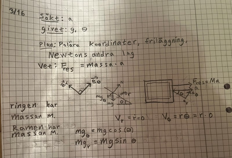 Eftersom ringen inte skall röra sig längs med stången tänker jag att vr = r-prick ska vara 0, men jag vet inte riktigt hur jag ska gå vidare från det. Accelerationen för ramen ska beräknas...men vilket samband har den med ringen?