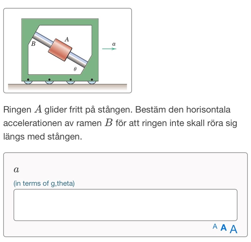 Bestäm den horisontala accelerationen för att ringen inte ska röra sig längs med stången.