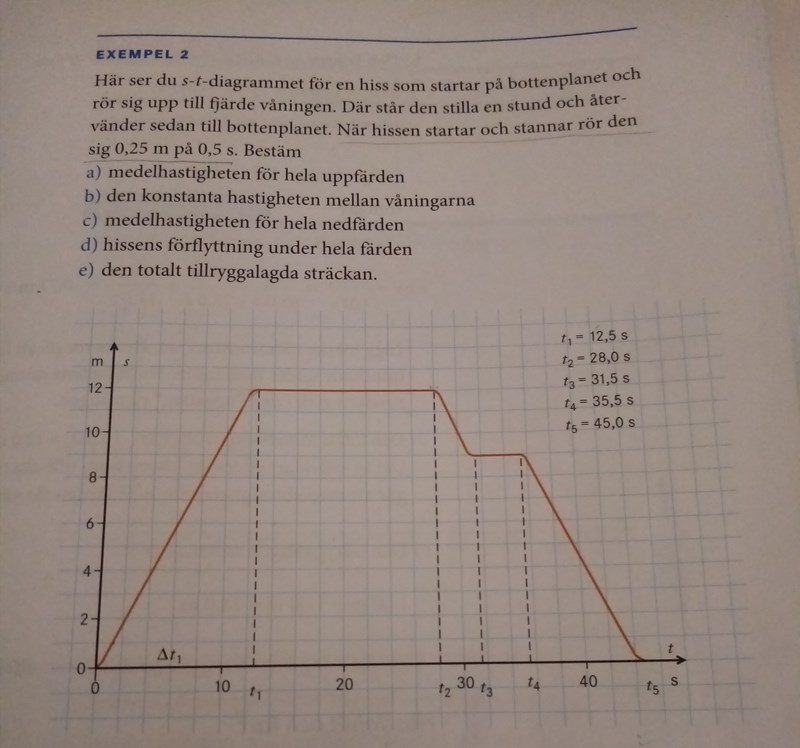 Hur kan man läsa av diagrammet att när hissen startar och stannar rör den sig 0,25 m på 0,5 s?