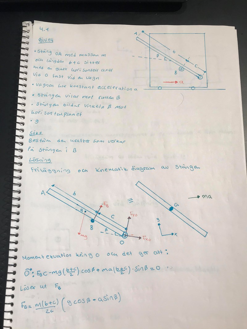 Jag har gjort friläggning och kinetisk diagram, men jag kommer lite längre en såhär, någon som kan hjälpa mig hur jag skulle kunna bestämma momentekvationerna F_o och F_B?