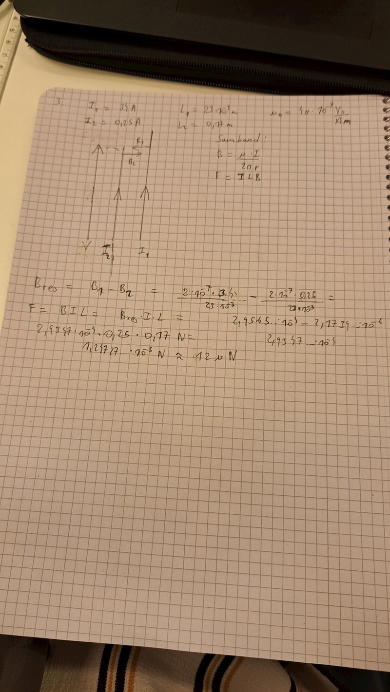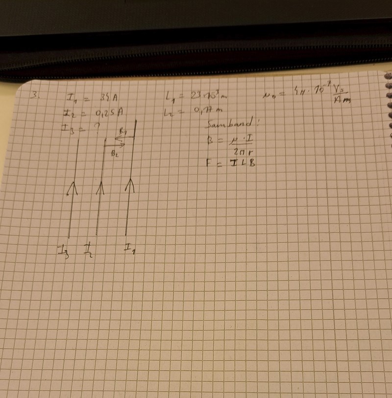 Jag är lite lost på denna fråga eftersom vi har 3 ledare. Jag kom fram till mha högerhandsregeln att ledare 1 påverkar ledare 2 med B1 och ledare 2 påverkar ledare 1 med B2. Sen kommer jag ingenvart. Ska man räkna ut I3?