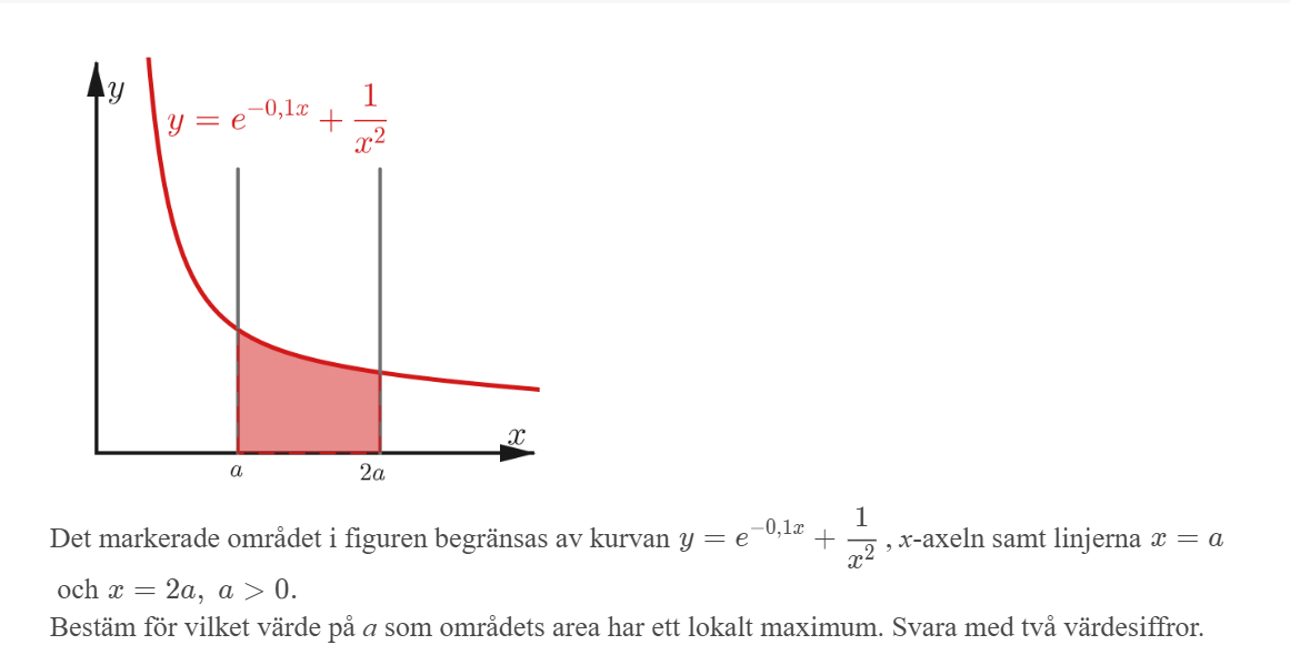 Arean kan beskrivas med: F(2a) - F(a). Arean kan skrivas som en funktion med a som oberoende variabel.