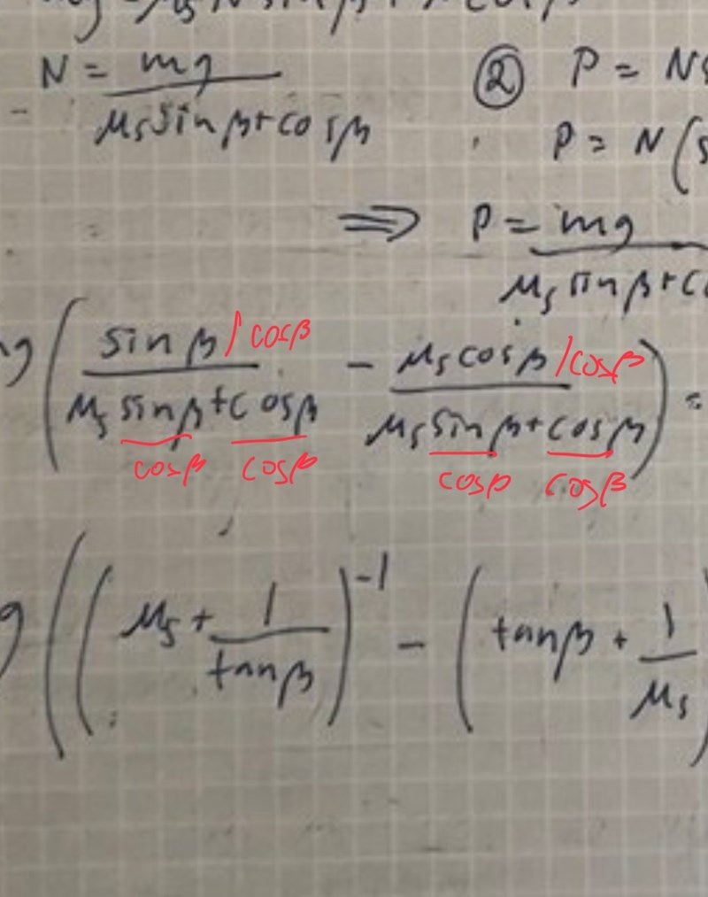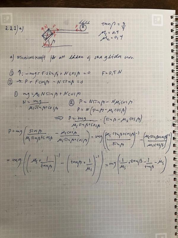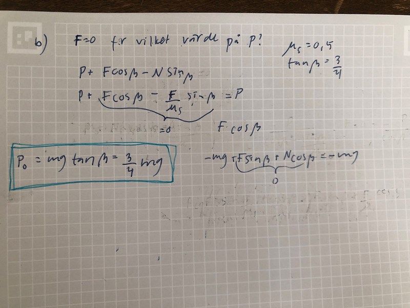 jag skulle behöva lite vägledning på uppgift B också. När är friktionskraften noll? Jag tänker att det är när ytan är helt glatt eller när lådan ej nuddar. I turkost står det rätta svaret. När jag försöker räkna på det får jag endast fram att p+0+0=p och likadant med formeln för mg.