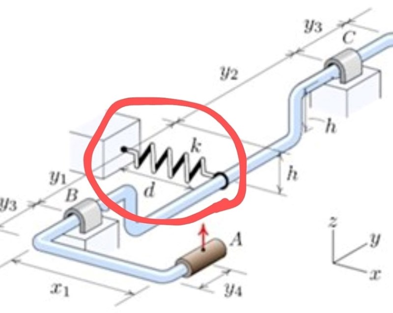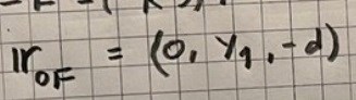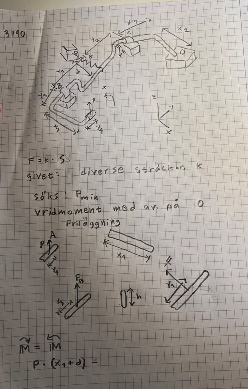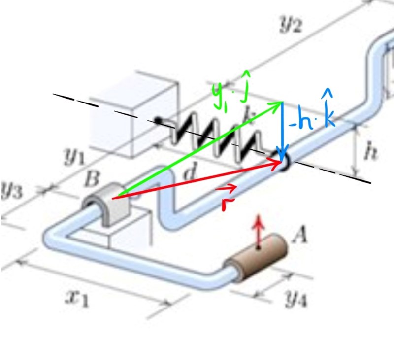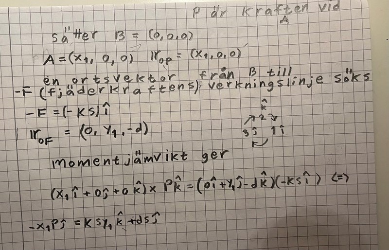 Sedan beräknade jag en ortsvektor mellan B och kraften P:s verkningslinje, rOA som blev (x1,0,0) och efter det beräknade jag en ortsvektor rOF mellan B och fjäderkraftensverkningslinje och fick den till (0,y1,-d). Jag kom fram till att fjäderkraften borde verka i negativ x-axel riktning så satte dess längd till -ks.