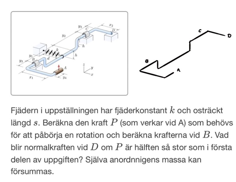 Hmm. Jag tror inte det tyvärr...eftersom massan försummas borde en normalkraft finnas vid C men ingen tyngdkraft och likadant för D och B? Och alla normalkrafter är riktade uppåt så de bidrar till moturs-momentet? Kraften som krävs för att påbörja en rotation...kanske måste kraften P, kraften vid B, kraften vid C och kraften vid D tillsammans vara lika stora som fjäderkraften?