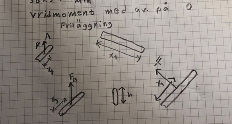 Sen när det gäller den så kallade friläggningen så har jag jättesvårt att förstå vilka krafter som verkar och vilka man ska ha med när man frilägger i uppgifter. Jag vill gärna bli bättre på det. Tror du att du skulle kunna förklara vilka krafter och moment som jag har missat? Jag har typ försökt frilägga olika delar av röret och ritat ut de krafter som jag tror är med och påverkar.