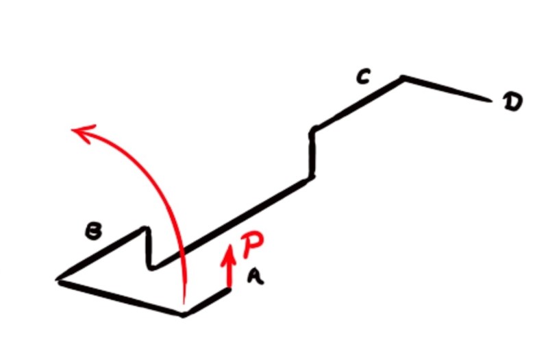 Kraften som krävs för att påbörja en rotation...kanske måste kraften P, kraften vid B, kraften vid C och kraften vid D tillsammans vara lika stora som fjäderkraften?
