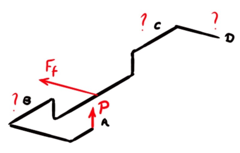 Men vad är krafterna i B, C och D? Kan du rita ut dem? Tänk mycket noga på frågeställningen