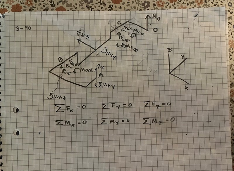Du är på god väg men borde systematisera det lite för att göra det enklare för dig. Det gängse sättet att göra på är att dela upp det i alla led. Alltså, x-led, y-led och z-led. Sedan räknar du kraft- och momentjämvikt.