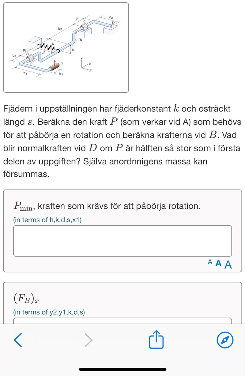 Hmm, nu tog jag momentet med avseende på z-axeln genom C, och fick -Fbx*(y1+y2) + (d-s)*k*y2 = 0 vilket gav Fbx = (d-s)*k*y2/(y1+y2) vilket blev rätt. Men vi antog ju i uppgiften att momentet vid C skulle vara 0. Så jag är inte med på noterna riktigt.