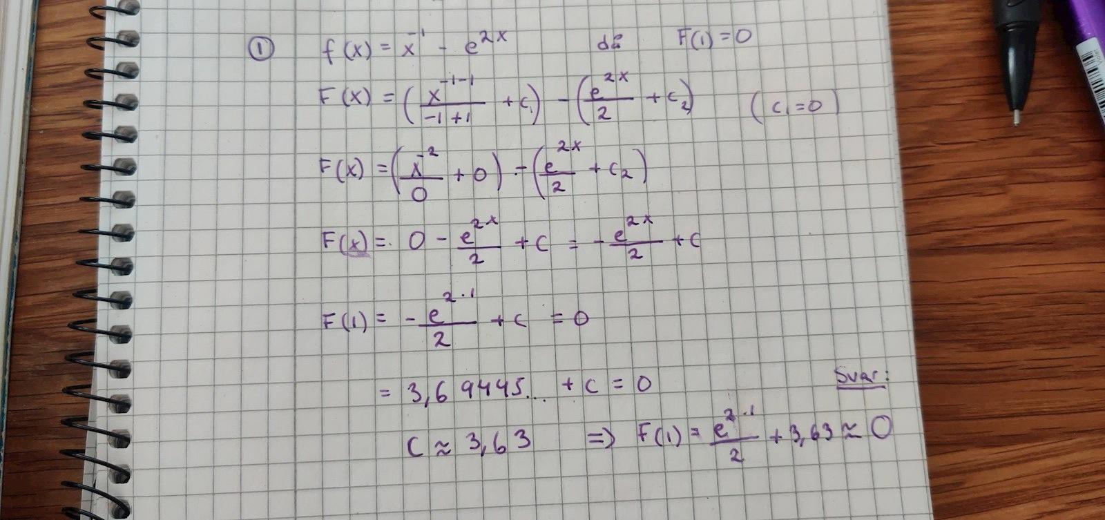 Bestäm den primitiva funktion F(x) till f(x)=x-1 - e2x som uppfyller F(1)=0.