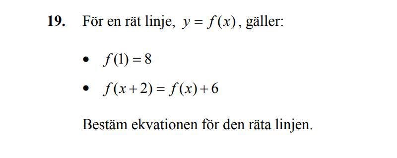Du kan börja med att rita. Rita in punkten (1,8) i ett koordinatsystem - du vet ju att f(1) = 8. Det andra sambandet säger att x ökar två steg, så ökar f(x) med 6 steg. Rita en ny punkt som ligger 2 steg till häger och 6 steg uppåt från (1,8). Dra en linje genom de båda punkterna.