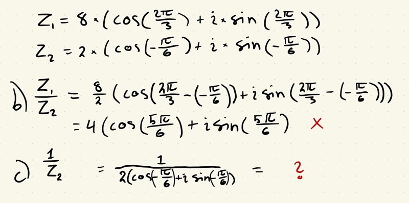 Har kommit till ett svar på c men jag får det till -sqrt(3)/4 istället för sqrt(3). Argumentet för 1 är ju pi, så det kommer att bli 6pi/6 + pi/6 = 7pi/6, vilket jag får till då -sqrt(3)/2 för cos och -1/2 för sin då det är i fjärde kvadranten. Ser du vart jag tänker fel?