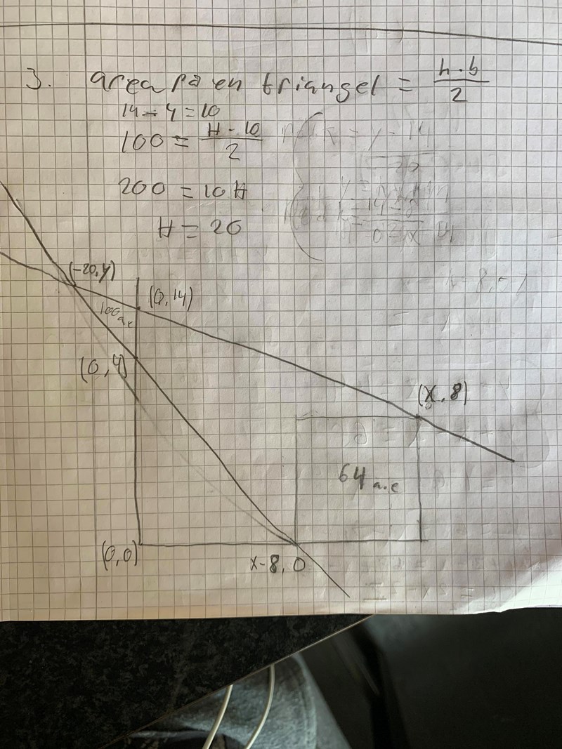 Den röda linjen har samma lutning hela tiden. Du har tre punkter på linjen, och lutningen mellan (-20,y) och (0,4) skall vara lika stor som lutningen mellan (0,4) och (x-8,0).