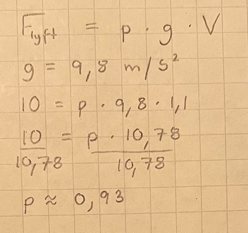 Det jag inte förstår är varför min metod inte fungerar? Det jag gjorde var att sätta in Flyft värdet 10 från tabellen och V värdet 1,1 cm3. g var redan givet i uppgiften, så jag ställde upp en ”ekvation” för att bryta ut ”p”, som du kan se i min uträkning. Jag skulle verkligen uppskatta om någon skulle vilja förklara varför det inte går att lösa uppgiften på mitt sätt och hur jag ska veta vilken metod jag ska använda ifall jag stöter på sådana här frågor framöver.