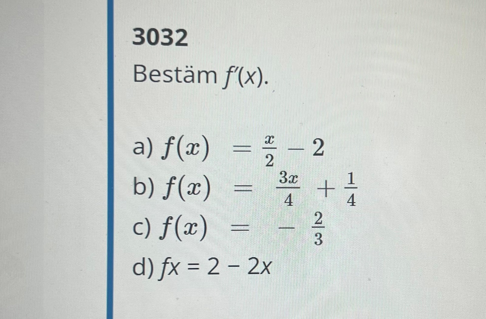 pga uttrycket kan skrivas om till 1x/2 -2. Derivatan av x och 0 är noll.