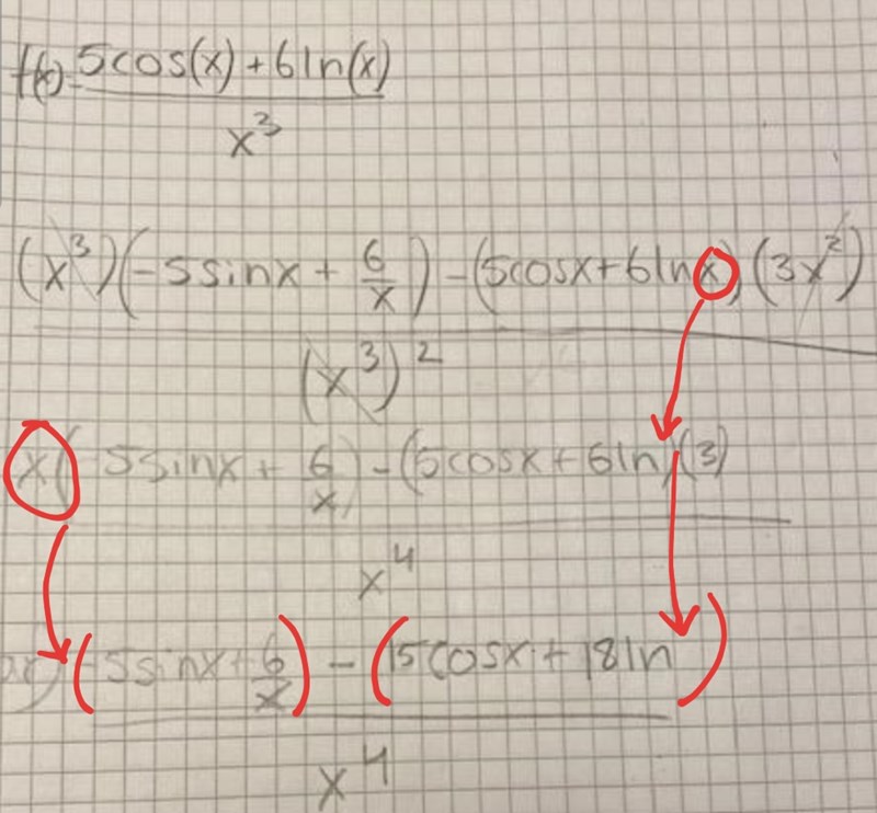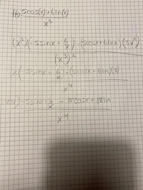 ska bestämma derivatan till funktionen f(x)=5 cos(x)+6 ln(x)/x^3