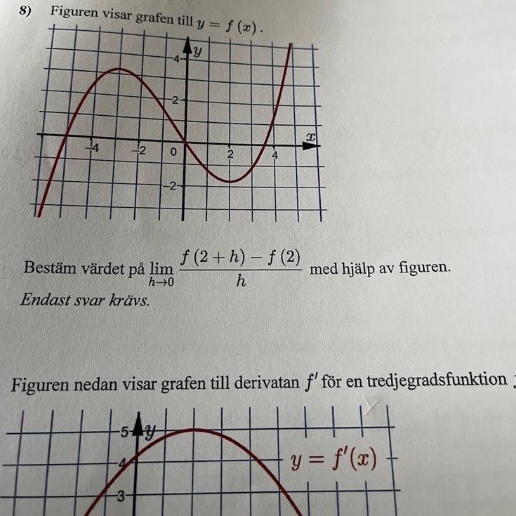 Det du ska beräkna är . Detta är derivatans definition skriver för funktionen f(x) vid punkten 2. Med andra ord ska du beräkna lutningen vid x=2 som i bilden framgår är 0.
