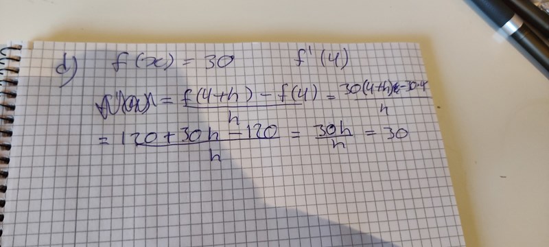 Om jag deriverar f(x) = 30 får jag noll. Men vad har jag gjort för fel i uppställningen? Hade jag haft att det blir = h^2 * 30 blir det noll när lim h--) 0. Men det kan jag inte få ihop det till.