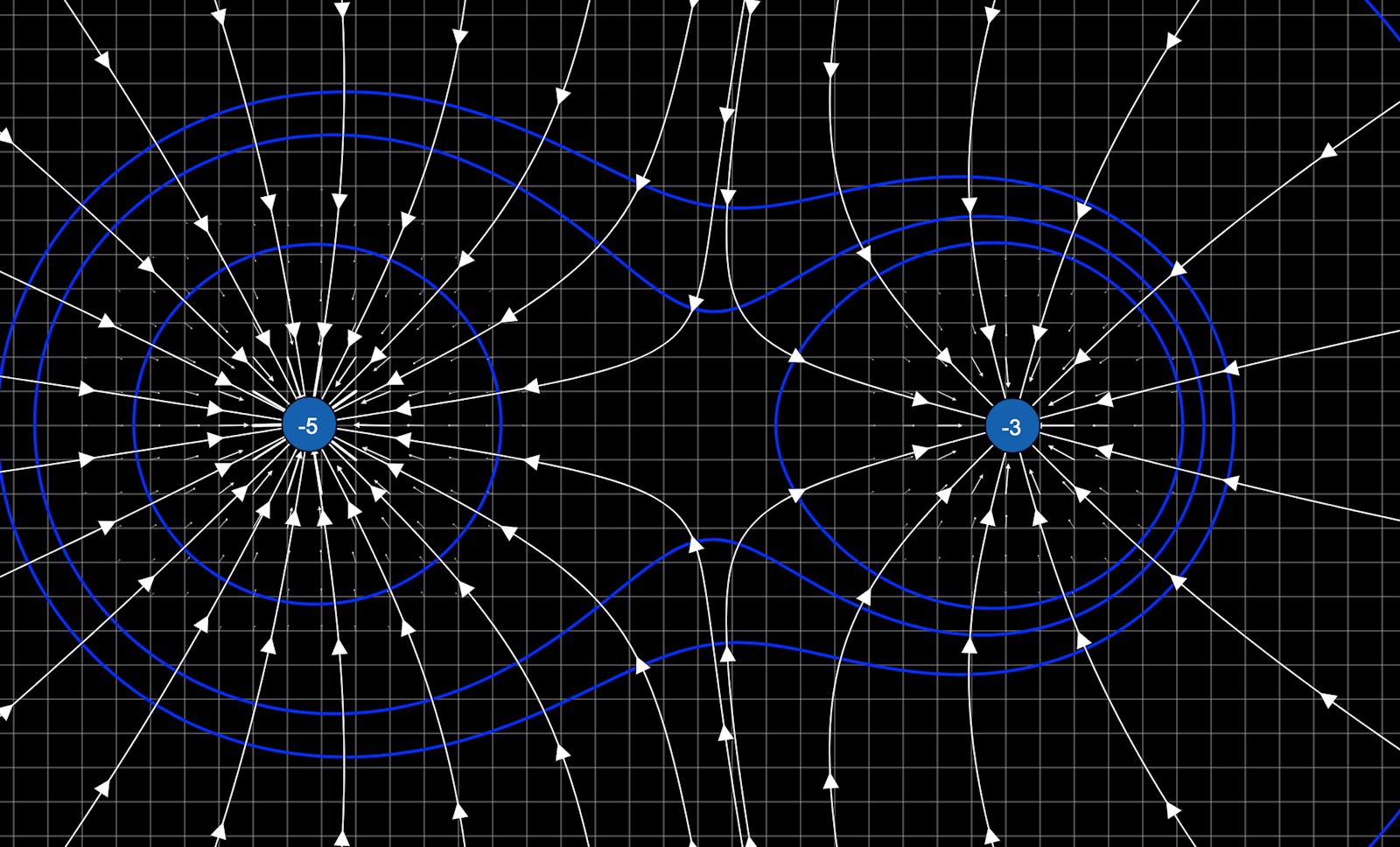 Så här gan man dra fältlinjer och fältvektorer kring två negativa laddningar (med några ekvipotentialytor):