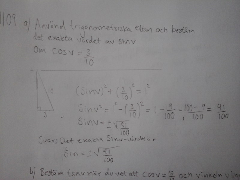 Bestäm det exakta värdet av sinv om cosv = 3/10