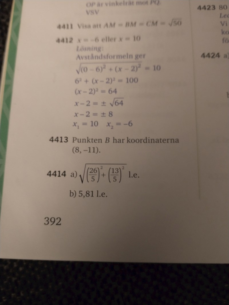 Jag kan endast lösa uppgift 4414 här genom trigonometri, men gissar att det finns lättare sätt och att det inte sammanfaller med kapitlets syfte riktigt som är om avståndsformeln.