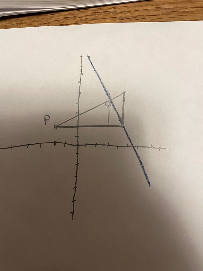 kunde då ta längdenheterna i X (hypotenusan) och ta X cos och sin för vinkeln som är 63.44 för att få ut kateterna på vinkelräta triangeln, varav den längsta kateten då ger kortaste avståndet. 5.81 l.e