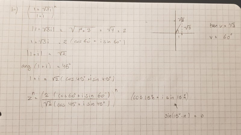 Jag glömde det komplexa talet som finns i nämnaren; som motsvarar en rotation 45 grader medurs. Kvoten motsvarar därför en rotation grader moturs, så frågan blir att bestämma där grader.