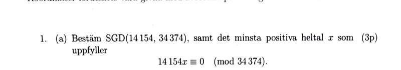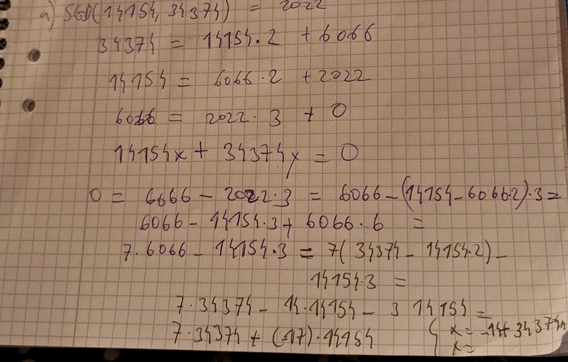 Jag är inte helt hundra på om jag hänger på vad du gör. SGD(14154,34374)=2022 borde vara sant , om inte vet jag inte vad jag ska göra? jag körde euklides algoritm som alla gör på youtube och föreläsningar och sen skrev jag allmän formel för denna allmänna lösningen för x då. Ditt sätt är väldigt främmande för mig då jag inte förstår varför man från ingenstans dividerar med SGD och hur vet man att man skall göra det utan räknare? Varför kan man inte köra euklides baklänges som jag gjort?