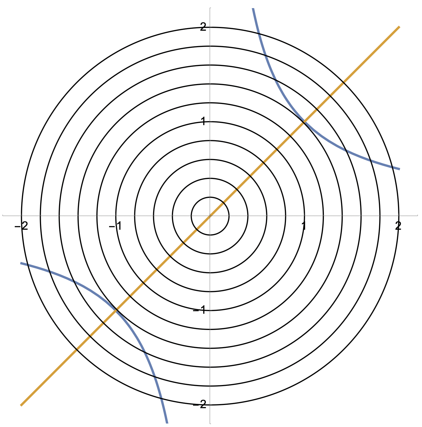 Det behövs ej. xy=1 eller y=1/x är en välkänd kurva som går genom (1,1) och avståndet |z| är i praktiken cirkelradier. Du skissar lätt denna bild för hand och inser vad minsta radien är.