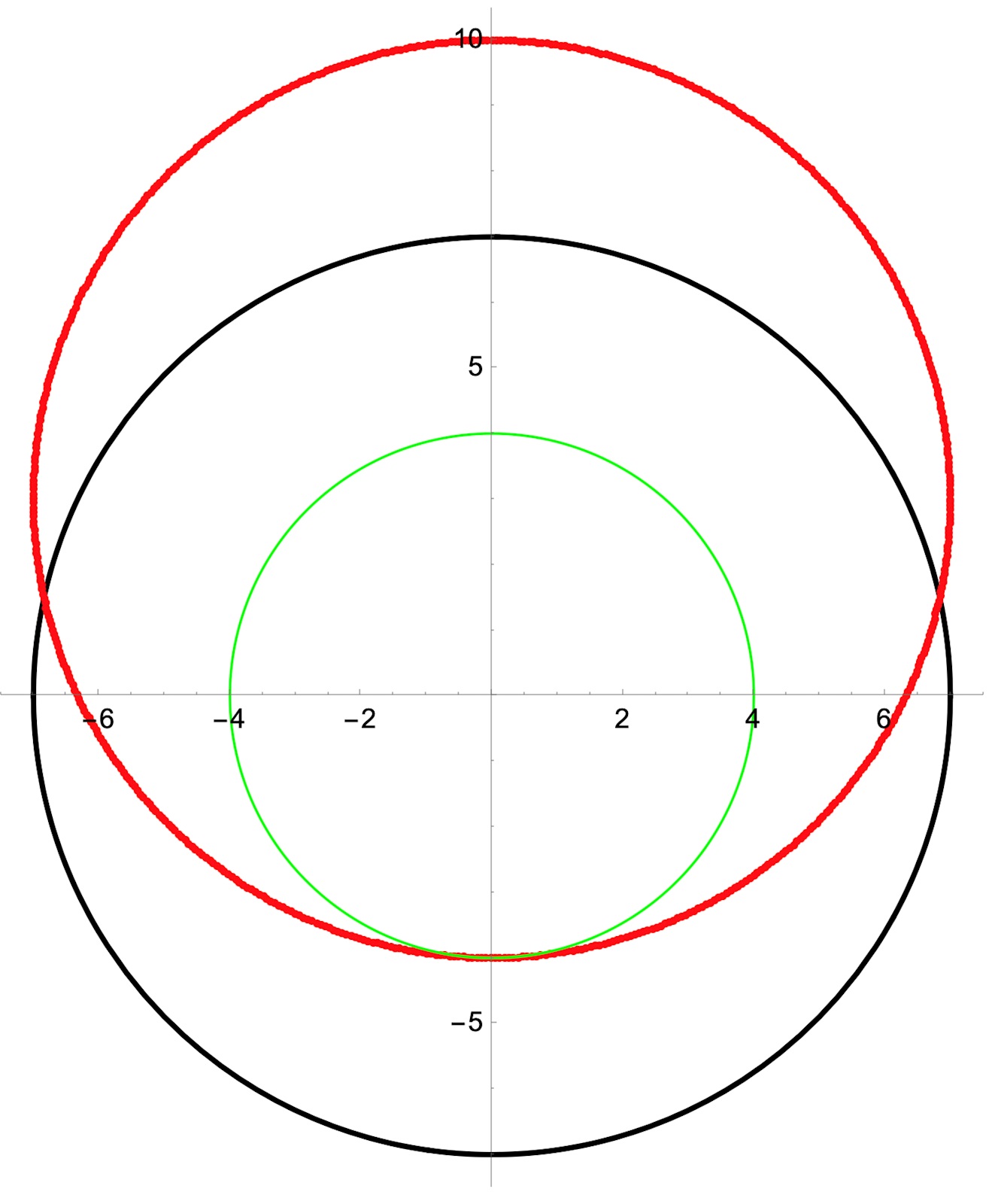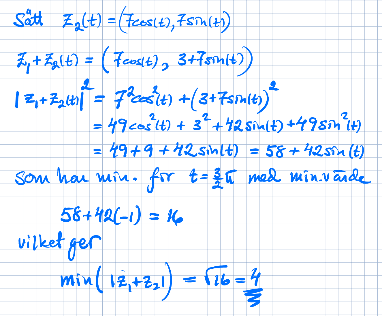 Svart cirkel är |z_2|=7 och röd cirkel är svart cirkel förflyttad z1=+3i, dvs +3 steg i vertikalled. Detta är punkterna z_2+z_1. Minsta avståndet från origo är 4 (punkten -4i).