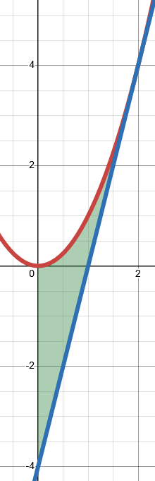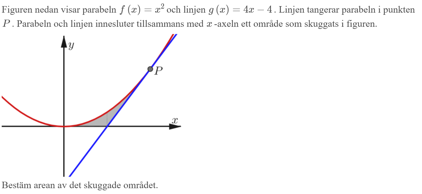 Den givna funktionen g ger för y=0 att x=1 så triangelns area är 4x1/2=2 Så den sökta arean blir 8/3 - 2 =2/3.