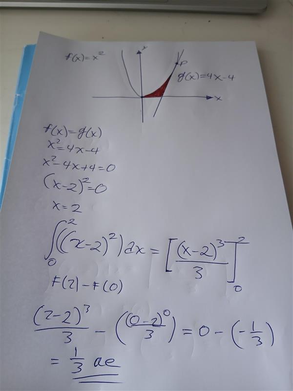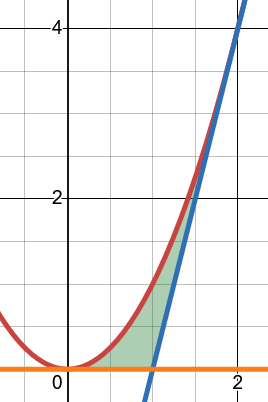 Den sökta arean är skillnaden mellan integralen av x2 från 0 till 2 som blir 8/3 och den vita triangeln i ``8 ovan.