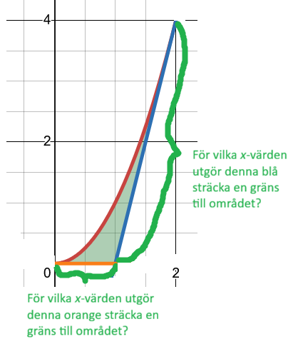 Tänk dig att området är omslutet av stängsel med tre olika färger - rött, blått och oranget - beroende på vilken kurva som utgör gränsen. Man vill ta reda på x-värdena där man har det blå stängslet respektive det orange stängslet, d.v.s.