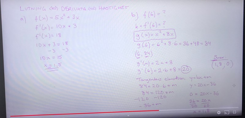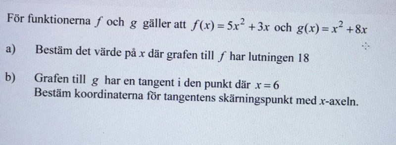 I a-uppgiften vill man ta reda på x-värdet för den punkt på kurvan som har derivatan 18. Det betyder att man vill lösa ekvationen f'(x)=18.