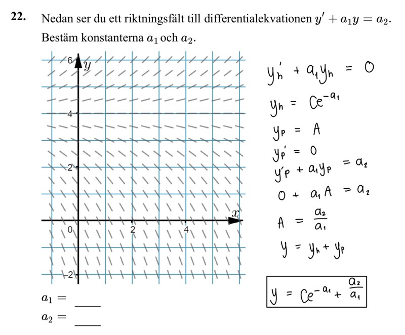 Skulle uppskatta lite hjälp med hur man ska tänka på den här uppgiften. Har bestämt en allmän formel för differentialekvationen men vet inte hur jag ska ta hjälp av riktningfälten för att bestämma konstanterna.