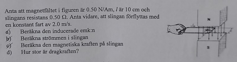 Har fastnat på d-delen av detta problem. Förstår inte riktigt hur man ska ta reda på dragkraften. Man kan väl inte bara anta att den är lika stor som den magnetiska kraften.