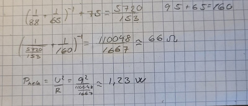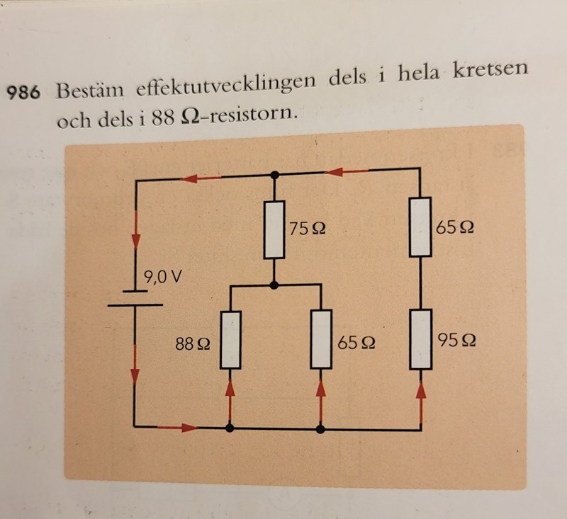 Jag har räknat effekutvecklingen i hela kretsen genom P=U2 /R. Men det blir inte rätt hur jag en försöker räkna effekten för bara 88-resistorn.
