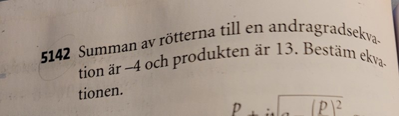 Ska jag använda det jag fick ut i p och q och stoppa in de i pq-formeln för att sedan få ut rötterna och sedan (addera rötterna=-4) och (multiplicera rötterna=13), och sen göra ett ekvationssystem?