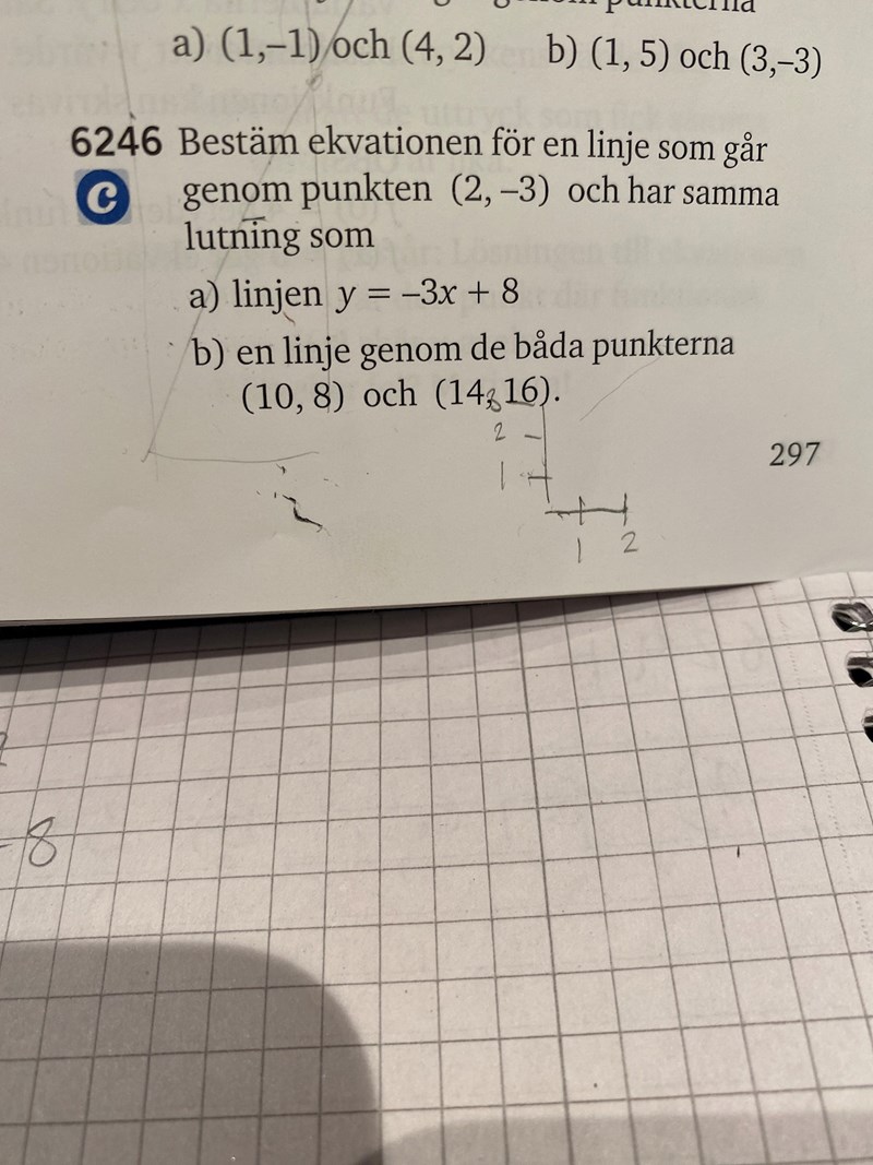 Programmeraren skrev:Om två linjer är parallella har de samma k. Dessutom har du fått en punkt. Hur kan du kombinera detta?