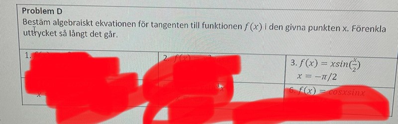 plommonjuice87 skrev:Då får vi väl tillbaka till den ursprungliga funktionen. Där vi sätter in vårt x värdet (-pi/2) och sedan får vi ut ett y-värde då? Men behöver vi verkligen y-värdet? Vi ska ju ha en ekvationen bara.