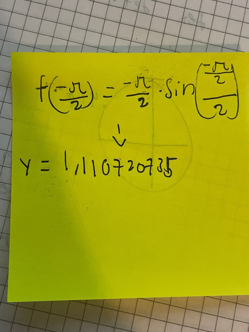 Då får vi väl tillbaka till den ursprungliga funktionen. Där vi sätter in vårt x värdet (-pi/2) och sedan får vi ut ett y-värde då? Men behöver vi verkligen y-värdet? Vi ska ju ha en ekvationen bara.