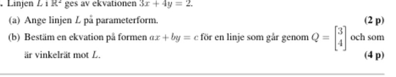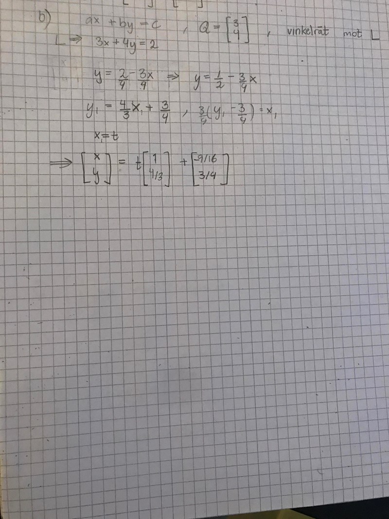 Försökte lösa b) såhär, är det rätt? Känns lite ”gymnasieaktig” lösning genom att hitta lutningen vinkelrät mot annan linje osv