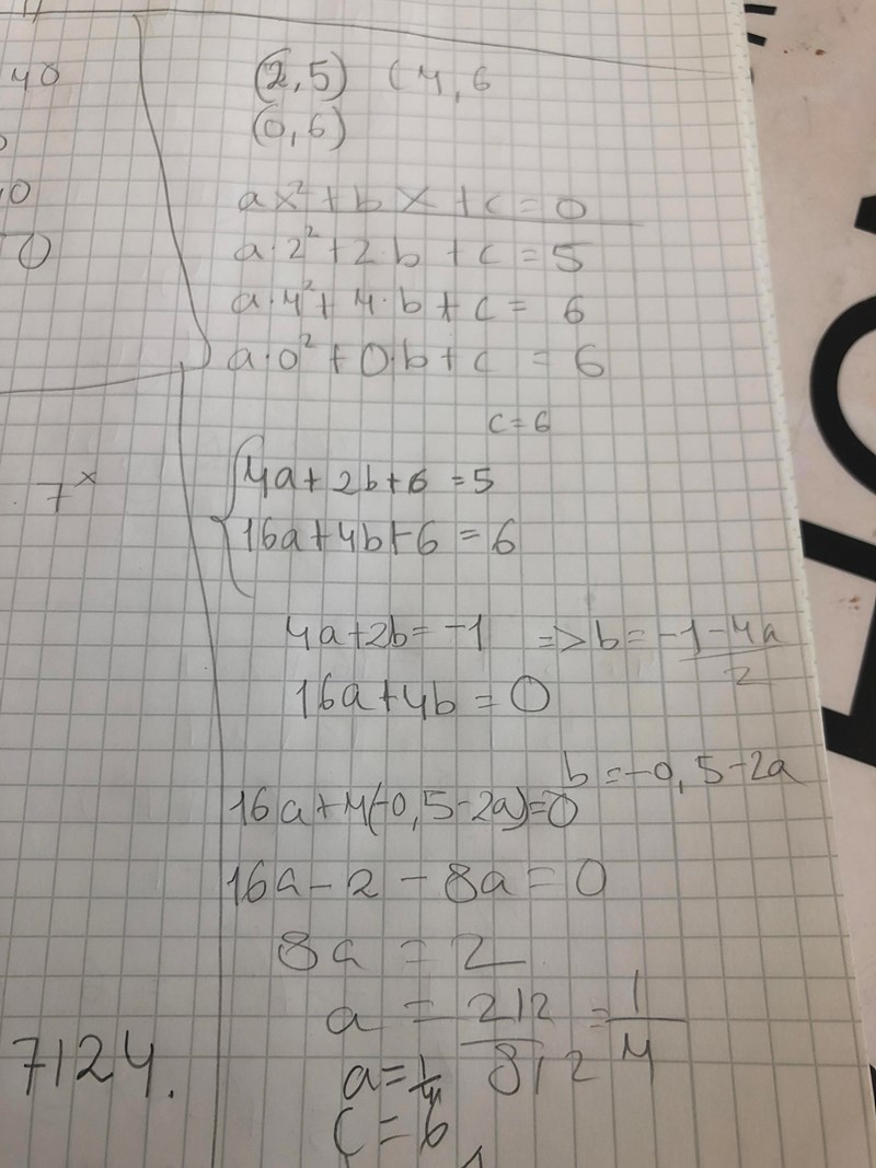 Parabeln y= x^2/4 flyttas i koordinatsystemet så att kurvans minimipunkt hamnar i (2,5). Bestäm den förflyttande parabelns ekvation i formen y=ax^2+bx+c