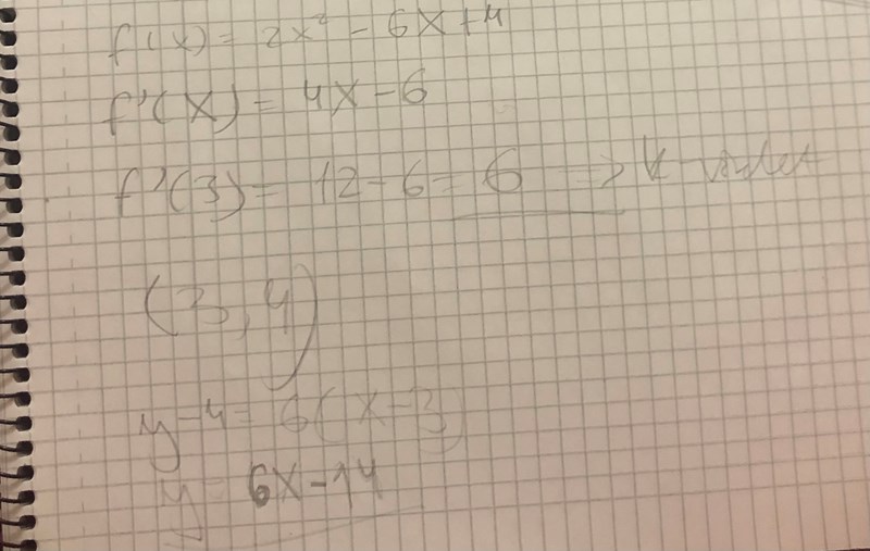 Lisa14500 skrev:Bestäm ekvationen för tangenten till f(x) = 2x^2 - 6x+ 4 i punkten x = 3 och skissa grafen och tangenten.